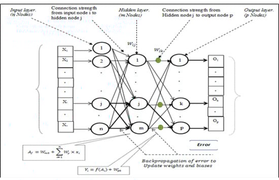 The literature contains many kinds of neural networks that have been put to many uses. The Multilayer Perceptron (MLP) is a commonly used ANN configuration utilized regularly in the hydrological modeling field [,] (Figure 2). This study assesses the usefulness of neural MLP networks for the estimation of EP. The MLP is the most frequently used and simplest neural network architecture [].