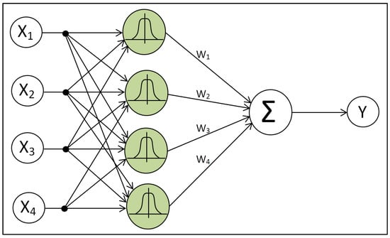 Another architecture that is used commonly in ANN is the RBF. Multilayer and feed-forward RBF is often used for multi-dimensional spatial interpolation. The word “feed-forward” means the neurons in a layered neural network are arranged in layers []. The underlying architecture of a neural network with three layers is presented in Figure 3, with one hidden layer between input and output layers. The activation function of each neuron has the form of an RBF, generating a response only if the inputs are close to some central value determined for that particular neuron.