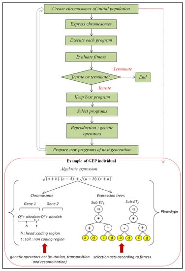While ANNs are complicated models that typically do not capture the physical relationships between different process components understandably, GEP models can express the relationship between dependent and independent variables explicitly []. The procedure for modeling daily evapotranspiration (considered to be the dependent variable) based on weather variables (considered as the independent variables) involves the following: selecting the fitness function; selecting terminals T and set of functions F for creating chromosomes; selecting chromosome architecture, and selecting the link function and genetic operators (Figure 4) [].