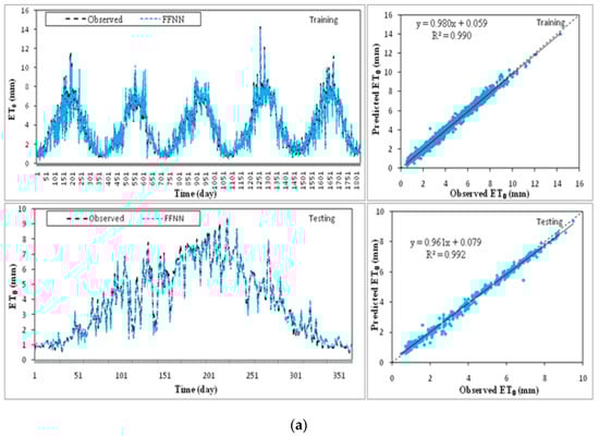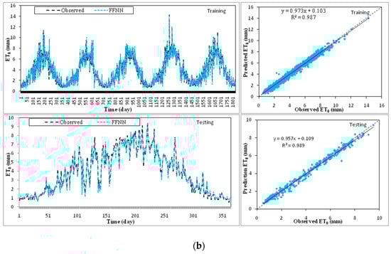 Performance evaluation results suggest that the FFNN2 model performed better than other input combination-based models. As to comparing various input combination-based models with one another, the results in Table 4 indicate that several other models are comparable in performance to the best model (FFNN2) while having a lower number of required input meteorological variables. Overall, going with the assessment in Table 4, the FFNN11 model (Tmean, RH, WS, and GR) is suitable for predicting ET with R2 values as 0.9875, 0.9892, RMSE values as 0.2656, 0.2623, and E values as 0.9873, 0.9877 for both training and testing stages, respectively. The same number of neurons (19) is used in the single hidden layer for achieving this performance, similar to the FFNN2 model. The performance and agreement plot among actual and predicted values of the FFNN11 model for both the training and testing stage is shown in Figure 5, which points to the fact that max values lie very close to the line of perfect agreement and follow the same pattern as the actual values in both training and testing stages.
