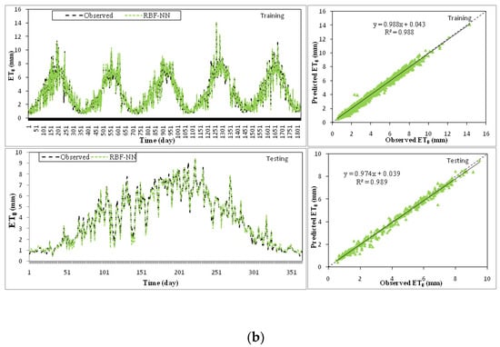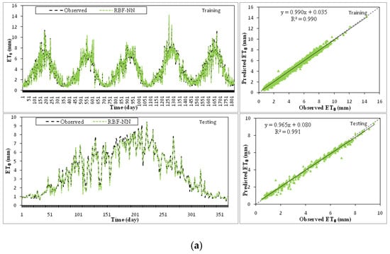 The performance evaluation results suggest that the RBFNN5 model performs better than other input combination-based models. On intercomparison among various input combination-based models, the results in Table 5 indicate that the performance of several other models was comparable to the best model (RBFNN5) and involved a lower number of inputs. Overall, the assessment mapped out in Table 5 shows that the RBFNN11 model (Tmean, RH, WS, and GR) is suitable for predicting the ET with R2 values as 0.9886, 0.9892, RMSE values as 0.2514, 0.2551, and E values as 0.9886, 0.9884 for both training and testing stages, respectively. A lower rate of spread (Table 5) was used in the development of this model than in the case of the RBFNN5 model. The performance and agreement plot among actual and predicted values of the RBFNN11 model for both training and testing stages are shown in Figure 6, which shows that max values lie very close to the line of perfect agreement and follow the same pattern as the actual values in both training and testing stages.