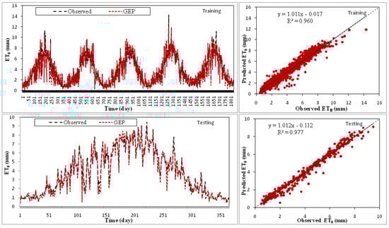 The details of parameters used in the GEP model are listed in Table 6. The performance of all input combination-based GEP models is listed in Table 7 for the training and testing stages. GEP based model development is also a trial and error process similar to the model development typical of FFNN and RBFNN models. For the performance of GEP models under different input combinations, for the training phase, the R2 ranged between 0.6973 and 0.9664, RMSE ranged 0.4830–1.3112 mm day−1, and EF ranged 0.6895–0.9579. So, for the test phase, the R2 ranged between 0.8057–0.9775, RMSE ranged 0.3701–1.1224 mm day−1, and E ranged 0.7744–0.9755 (Table 7). It is clear that the presence or absence of critical meteorological variables in the input combinations significantly affected GEP model performance. The results of Table 7 suggest that the GEP11 model, including Tmean, RH, WS, and GR parameters in the input combination, performed better than other input combinations and GEP based models with R2 values as 0.9606, 0.9775, RMSE values as 0.4830, 0.3701, and E values as 0.9579, 0.9755 for the training and testing stages, respectively. The performance and agreement plot among actual and predicted values of the GEP11 model for both training and testing stages are shown in Figure 7, which indicates that max values lie very close to the line of 450 and follow the same path as the actual values in both training and testing stages. Table 7 concludes that the GEP11 model is the best performing model with optimum input combinations.