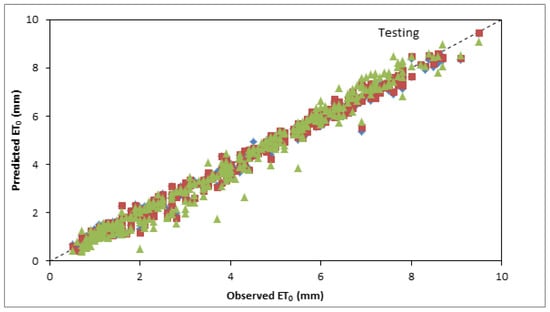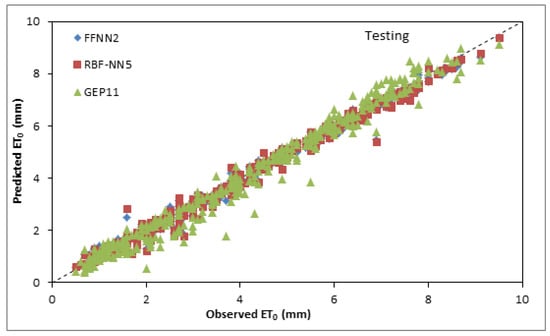 The overall performance of the FFNN2 based model is reliable and suitable for the prediction of ET0. As such, Tmax, Tmean, (Tmax − Tmin), RH, I, WS, and the GR input combination-based FFNN model could be used for the prediction of ET0. However, the results mapped out in Table 9 of single-factor ANOVA suggest that there is no significant difference between observed and predicted values using FFNN, RBFNN, and GEP best combination-based models.