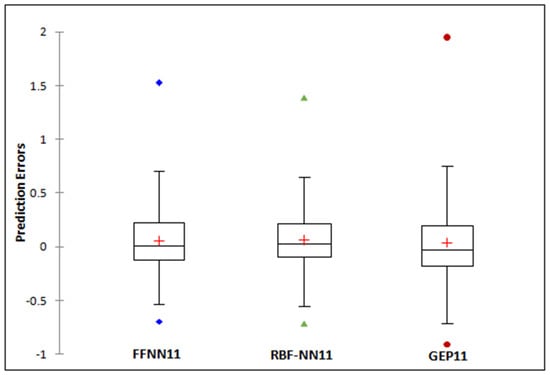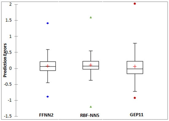 Figure 12 displays the box plot for the prediction errors for the optimum input combination-based models using the test period. The descriptive statistical values of prediction errors for the optimum input combinations are listed in Table 13. According to Table 13 and Figure 12, the RBFNN11 model has followed the corresponding observed values with lower maximum error (1.3700), and the width of the first quartile (−0.0952) is less than other optimum input combination based models.