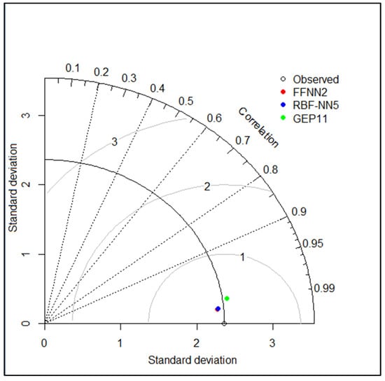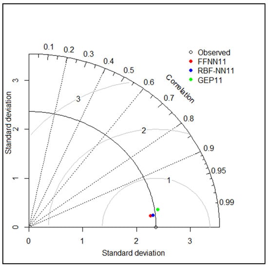The Taylor diagram of the observed and predicted ET0 by different optimum input combination-based models over the test period is depicted in Figure 13. It is clear that the representative points of all the applied models have nearly the same position. The RBFNN11 model is located nearest to the observed point with the lower value of RMSE, SD, and higher value of the coefficient of correlation, making this model emerge as a superior model with the optimum number of input parameters.