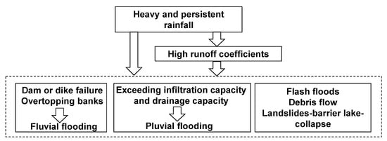 Extreme floods are caused by the interactions of atmospheric processes, basin hydrological processes [21,22], and human activities (refer to Figure 1). Heavy and/or persistent precipitations are usually the very first cause of extreme floods, which is not the case for small floods. The land use changes [23], due to fast urbanizations or geographic variations, will increase the runoff coefficient, enhance runoff generations, and then increase flood peaks and volumes in the rivers. In this case, fluvial flooding occurs when rivers flow overtop their banks or dams/dikes break. Dam overtopping is one of the main reasons for dam break [24]. Pluvial flooding occurs when rainfall volumes exceed the infiltration capacity and the drainage capacity and result in the inundation of urban areas. Besides, the collapse of the barrier lakes in mountainous areas, formed by landslides, is likely to cause extreme floods downstream.