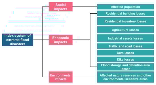 Extreme flood disaster is a threat caused by extreme flood to human life, property, sensitive ecological and environmental areas, etc. Extreme flood is characterized by a wider inundation range, higher hazards, and therefore, probably leads to a wider range of affected areas. Correspondingly, the category of expected disaster-bearing bodies is much wider. For example, flood control structures, such as dikes and dams as part of flood disaster prevention systems, are not only flood prevention forces but also disaster-bearing bodies under extreme floods [25]. In addition, extreme floods also likely cause negative impacts on sensitive ecological areas, such as protected surface and groundwater as well as nature reserves. On this basis, we draw the extreme flood disaster chain in Figure 2. The direct impacts include economic, social, and environmental consequences. Among them, the economic impacts include the damage to houses, agriculture, industry and commercial assets, and damage to critical infrastructures, such as transportation, water supply, power supply, and communication systems. Social impacts mainly refer to people affected by the evacuation, homelessness or injury, and potential human casualties [26]. Environmental impacts include scouring the sensitive ecological and environmental areas or polluting sensitive ecological and environmental areas after extreme floods flow through potential pollutants. Moreover, in modern society, since the construction of urban flood control and drainage facilities lags behind the construction speed of urbanization, and lifeline projects, such as communication, power supply and water supply, have more weaknesses, extreme floods are likely to result in much larger flood impacts than flooded areas. Then, extreme floods probably further lead to indirect impacts beyond the geographical area or after the flood events. For example, the disastrous river floods that occurred in Thailand in 2011 seriously disrupted the global supply chains [27].