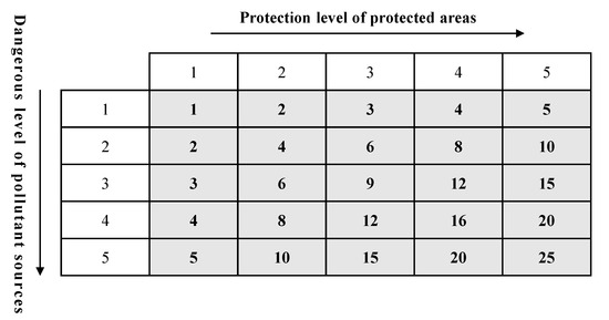 (5) Determine the classification criteria of dangerous level and protection level (see Table 3) and then combine the two aforementioned levels using the matrix method (see Figure 6) to determine the severity level of the environmental impacts.