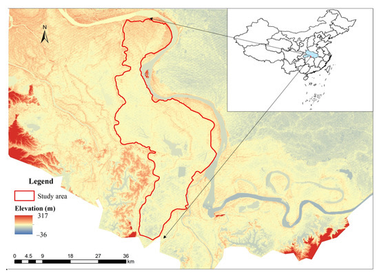Location of the study area (JFDD), which is located in Hubei province (the light blue area on the map of China) and along the Yangtze River. The reference coordinate system is WGS84.