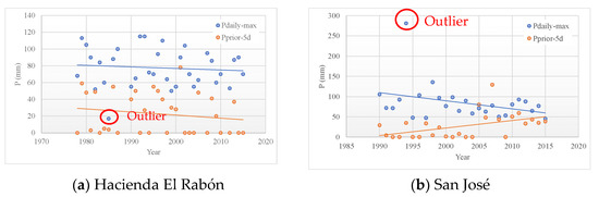 For each station, the data recorded from the date of installation to 2015 were analyzed. According to the recommendations of the U.S. Water Resources Council [13] and Cunnane [14], possible outliers were identified and filtered for the 24 h maximum rainfall data. The outliers were not identified for the analysis of the total 5-day antecedent rainfall. The graphs in Figure 2 show a relationship between the years analyzed and the maximum rainfall in 24 h, where it is observed that the Hacienda El Rabón and San José rainfall stations present a decreasing trend line over time. In 1985 and 1994, these values were eliminated from the stations of Hacienda El Rabón and San José, respectively, since they were outliers.