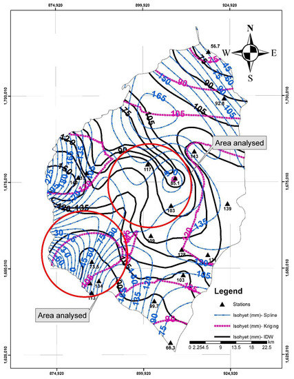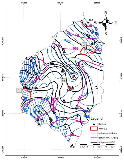 From the cumulative precipitation during the 5 areal days, the root mean square error (RMSE) was estimated. Table 7 shows the RMSE results obtained for the different interpolation methods. The maximum and minimum RMSE values obtained by the IDW method were 2.19 and 0.33 mm, respectively. These results confirm that the manual adjustments made to this method were minimal. The RMSE values of the kriging method range between 0.81 and 4.37 mm. This method also did not show many variations with respect to the adjusted IDW method. The variations in the kriging method with respect to the adjusted IDW occurred due to the differences in average areal precipitation in the C3 basin, located exactly in the area where kriging presented little isoline interpolation. The RMSE results obtained by the spline method range between 1.55 and 42.35 mm. The large discrepancy of the spline method with respect to the adjusted IDW is because spatial rainfall distributions with negative values were generated over basin C1. This caused the underestimation of the mean areal precipitation in the C1 basin and, therefore, a higher mean square error.