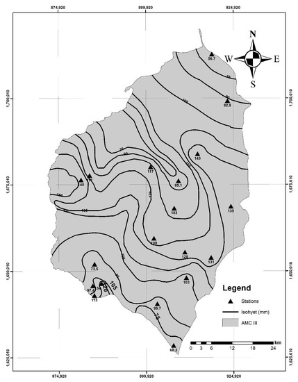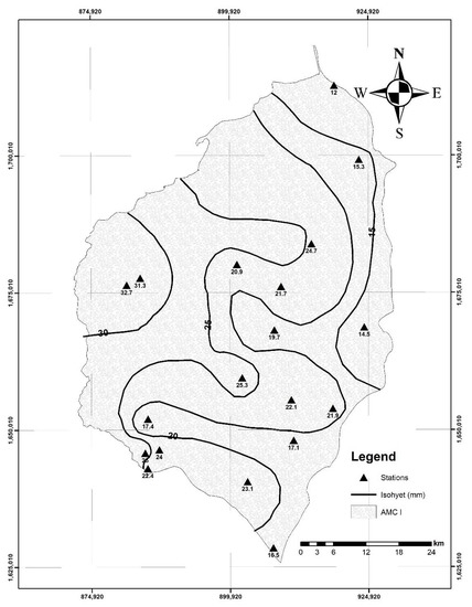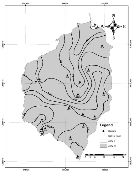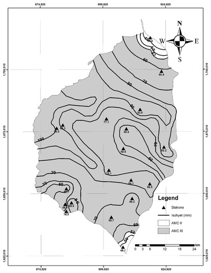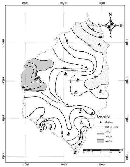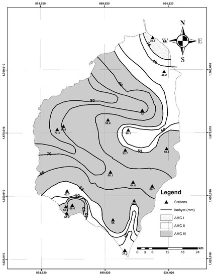 The antecedent moisture conditions of the soil play an important role in the design of hydraulic structures because they are directly related to the amount of runoff that can be generated for different return periods, which is one of the main conditioning factors for the runoff response of a drainage basin [3,4]. The Natura Resource Conservation Service (NRCS) of the United States (1972) [1] developed the curve number infiltration method, which allows estimating direct runoff, taking into account the characteristics of the soil, its use and vegetation cover. From the maximum 24 h rainfall records, the type of antecedent moisture can be established. The moisture condition (AMC II) corresponds to the average moisture of the soil. If there are high rainfall intensities during the 5 days prior to the most intense downpour, saturated soil conditions will occur, which is known as antecedent moisture condition type III (AMC III). Otherwise, if rainfall intensities are low, the soil will have the capacity to infiltrate a significant percentage of the direct runoff (AMC I). The AMC plays an important role in the rainfall-triggered shallow landslides [5,6,7]. Table 1 shows the classification of the antecedent moisture conditions as a function of the total 5-day antecedent rainfall for the type of rainfall station.