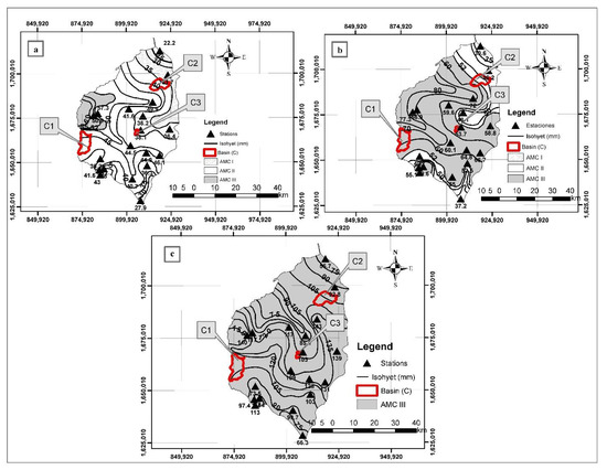 The spatial distribution of soil moisture content has been studied by different authors [29,30,31]. The spatial distribution of moisture can be variable even for small watersheds and should not be assumed to be constant because this could lead to modeling problems. This is evidenced in Figure 11, which shows the variations in the antecedent moisture conditions present in the drainage basins (C). For a 5-year return period, the C2 basin shows a spatial distribution of antecedent moisture content classified as AMC I and AMC II. This spatial distribution for the same basin for a 10-year return period presents AMC II and III conditions. For a return period of 100 years, the spatial distribution of the moisture content shows a classification of AMC III. On the other hand, drainage basins C1 and C3 present a spatial distribution consistent with AMC II for a return period of 5 years and AMC III for return periods of 10 and 100 years.