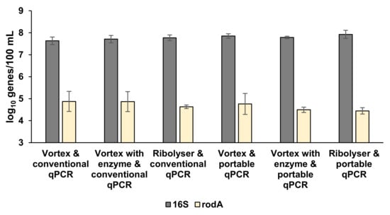 | Method | Filter (#) | DNA Yield (ng/100 mL) | Log10 16S rRNA (Genes/100 mL) | Log10 rodA (Genes/100 mL) |