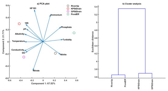 | Location comparison ANOVA with post hoc pairwise comparisons using Tukey’s honest significant difference criterion | One-way location p < 0.001 *** Pairwise comparison all p < 0.05 * except RiverUp vs. PondEff p = 0.61 | One-way location p < 0.001 *** Pairwise comparison all p < 0.05 * | One-way location p < 0.001 *** Pairwise comparison all p < 0.05 * except KPStDrain vs. GPStDrain p = 0.86 |