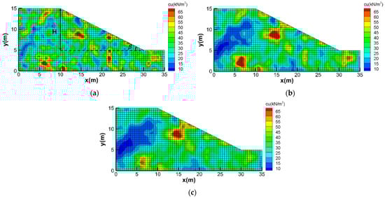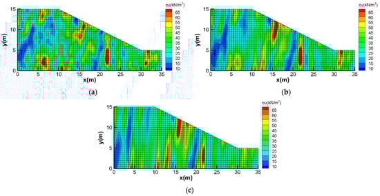 A synthetic slope model for MCS is created, which is discretized into 1520 square elements with the side equal to 0.5 m (Figure 1), height H = 10 m and slope inclination β = 26.6°. The left-side and right-side boundaries are assigned no horizontal displacement conditions and the bottom boundary is assigned no displacement conditions. The soils are assumed to follow the Mohr–Coulomb constitutive models. Additionally, the undrained friction angle φu = 0 and the unit weight γ = 20 kN/m3. The mean of cu is 34 kN/m2, according to Griffiths and Fenton [22] and the standard deviation of cu is 17. The slope is only subjected to gravity loads. Once these parameters are set up, the corresponding factor of safety for the slope can be evaluated based on the finite element strength reduction method [34]. For example, the factor of safety of Figure 1a as the input cu is 1.05.