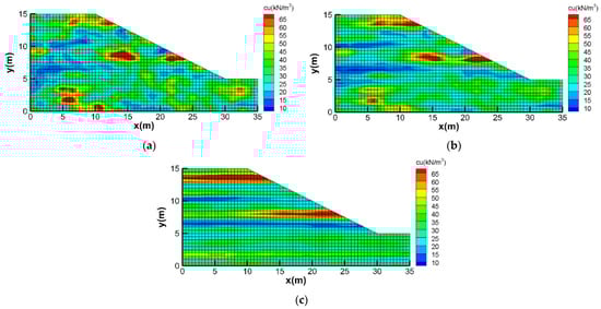 Numerically generated statistically anisotropic undrained shear strength fields (λx > λy): (a) λx = 2 m, λy = 0.5 m, (b) λx = 5 m, λy = 0.5 m, (c) λx = 25 m and λy = 0.5 m.