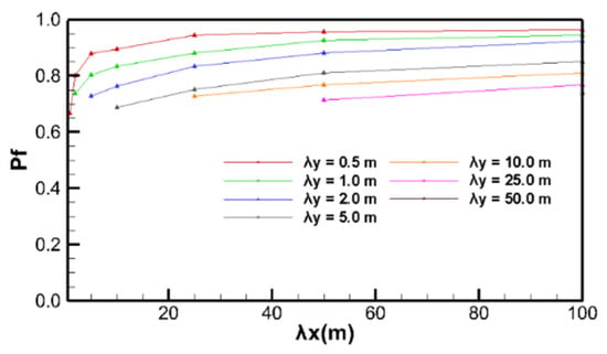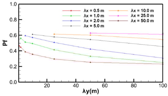 Figure 6 shows the relationship between pf and λy with different λx, where λy is greater than λx. Contrary to the pattern of λx on pf, with the increase in λy, pf decreases under the same λx. When λy was less than the slope height (H = 10 m), pf decreased rapidly and when λy was greater than the slope height, pf decreased slowly.