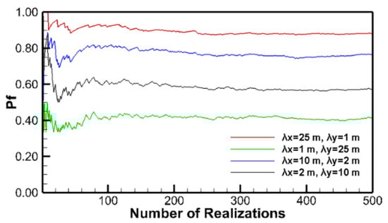 To ensure that the results of MCS with different correlation scales are representative, the mean of pf during MCS is examined. Figure 7 shows that the mean of pf changes with the increase in the number of realizations for four combinations of correlation scales (λx = 25 m, λy = 1 m; λx = 1 m, λy =25 m; λx = 10 m, λy = 2 m; λx = 2 m, λy =10 m). It is accepted that within 200 realizations, the fluctuation of the mean value of pf is large and after approximately 300 realizations, the mean value of pf becomes stable.
