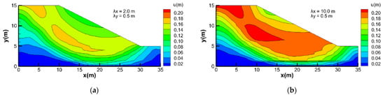 The contour map of the displacement of horizontal layered slopes with different λx: (a) λx = 2 m and (b) λx = 10 m.