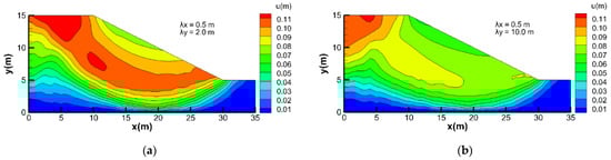 The displacement contour for the case where λx is less than λy is shown in Figure 9, where Figure 9a corresponds to the parameters in Figure 3a (λx = 0.5 m, λy = 2.0 m), which has a FS of 1.04 and Figure 9b corresponds to Figure 3b (λx = 0.5 m, λy = 10.0 m) with a FS of 1.07.