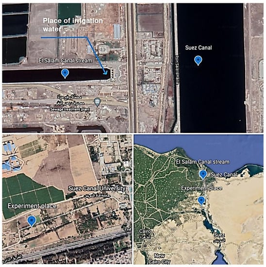 The study was conducted in the experimental farm of the Faculty of Agriculture, Suez Canal University, Ismailia, Egypt (30°37′06″ N 32°15′40″ E), as shown in Figure 1 during the growing season (November 2020 to February 2021). The average daily rainfall was 0.59 mm, with minimum temperatures varied from 6 to 20 °C and maximum temperatures varied from 15 to 33 °C during the growing season.