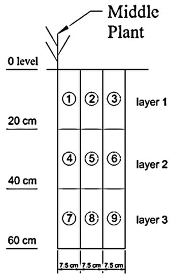 Soil preparation, cultivation method, fertilization, and weed and pest control were conducted according to the recommendations of the potato agricultural bulletin provided by the Egyptian Ministry of Agriculture for potato plants grown in sandy soils. The drainage water flow from the drain tubes was monitored and collected during the growing season. The total volume of the collected drainage water was measured by a volumetric cylinder. During soil preparation, a soil sample was collected to determine the initial properties of the investigated soil as shown in Table 2. At the end of the growing season, potato plant shoots were cut above the soil surface and kept in paper bags. Nine soil samples were taken for each lysimeter using a riverside auger. To represent the root zone of the middle plant, soil samples were obtained from three layers: 0–20, 20–40, and 40–60 cm, with distances as shown in Figure 4. Soil physical and chemical analyses were conducted according to [27,28].