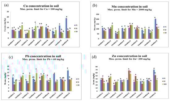 HM concentrations at different locations within the soil profile under different irrigation methods were shown in Figure 5a–d for Cu, Mn, Pb, and Zn, respectively. The figures show that irrigating with HM contaminated water increased the HM concentrations within the soil profile regardless of irrigation method. Average Cu, Mn, Pb, and Zn concentrations in different soil layers were higher than the initial HM concentrations. The figures also show that the maximum concentrations of HMs in soil irrigated with the three different irrigation methods are lower than the maximum permissible limits for HMs in soil, as mentioned by Weldegebriel et al. [7]. These limits are 100, 2000, 60 and 200 mg/kg for Cu, Mn, Pb, and Zn, respectively. For the upper two soil layers, DI produced the highest concentrations of Cu, Mn, and Pb at most locations within the upper soil layers (0–40 cm) as compared to FI and SI. The maximum concentrations of Cu, Mn, and Pb in the upper 40 cm soil layer were 12.0, 140.0, and 11.6 mg/kg, respectively. Maximum Zn concentration in the upper soil layer was observed under SI. This concentration was equal to 67.9 mg/kg. For the third soil layer, on the other hand, FI produced higher HM concentrations than SI and DI. Under FI, the maximum Cu, Mn, Pb, and Zn concentrations within the third soil layer were 18.8, 203.8, 13.3 and 70.0 mg/kg, respectively. This can be attributed to the wetted zone, the amount of water seeping below the root zone, and the irrigation efficiency. Under DI, the extension of the wetted bulb was limited to the upper two soil layers until a 40 cm soil depth, and the leaching amount below the zone of maximum root density was small. Therefore, maximum HM concentrations under DI were observed within the upper two soil layers. On the other hand, due to that the applied water was much higher than ETC in FI, a considerable amount of irrigation water seeped downward below the root zone causing the maximum accumulation of Cu, Mn, and Pb in the deepest (third) soil layer. Higher Zn concentrations in the first 20 cm soil layer were found under DI except for at location 1. However, they were observed in the second soil layer (20–40 cm) under SI except for at location 4. On the other hand, maximum Zn concentrations were found in the third soil layer (40–60 cm) under FI. Irrigating with water contaminated by HMs increases HM concentrations within the soil domain. Therefore, HM concentrations increased considerably in the first 40 cm soil depth under DI and up to a 60 cm soil depth under FI. These results concur with findings of Brar et al. [11] when investigating HM distribution under FI. The analysis of variance at p-level <0.05 showed that the concentrations of Cu, Mn, Pb, and Zn in soil were significantly affected by irrigation method. DI produced the highest concentrations of HMs in the upper soil layers (0–40 cm) and in FI the highest concentrations in the lower soil layer (40–60 cm). These results contradict with the findings of Cakmakci and Sahin [15]. They concluded that maize cultivation under FI with wastewater in sandy clayey loam resulted in statistically higher HM concentrations in all soil layers as compared to DI and SDI. The reason for this discrepancy may be attributed to the difference in soil texture that affects adsorption behavior. Moreover, the mechanisms of HM transport and accumulation in a soil–plant system can be greatly influenced by changes in soil pH, organic matter content, cation exchange capacity, soil salinity, metal chemical speciation, soil texture, nature and amount of nutrients, weather patterns, soil microbes, and other factors [15].
