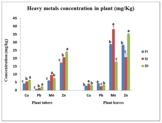 HM concentrations (mean ± SE; mg/kg) in both shoots and tubers of potato plants under different irrigation methods with HM contaminated water. Small letters show significant difference between irrigation methods. Bars with the same letter for the same metal refer to insignificant difference and bars with different letters for the same metal refer to significant difference at p-level < 0.05 according to Duncan’s multiple range test.