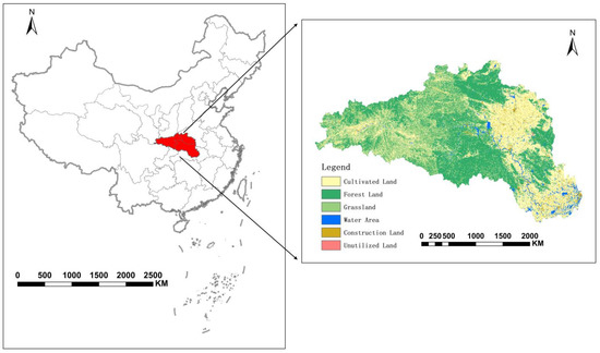 The Hanjiang Ecological Economic Zone is located in the hinterland of China. It is an economic development area with the Hanjiang Basin as a spatial carrier and is also a significant ecological corridor in the central and western regions. It involves 84 county-level cities in three provinces with a total landmass of 191,600 square kilometers. The Zone is in the subtropical monsoon climate region of East Asia, where the four seasons are distinct, and the climate is mild. Overall, the precipitation and temperature increase from northwest to southeast. The average temperature is 12~16 °C, and the average rainfall is 894 mm a year. It is a mountainous region with undulating terrain, and the elevation gradually increases from east to west. The types of landforms are mountains, hills, and plains in sequence (Figure 1). Based on the differences in natural foundations, the Danjiangkou Reservoir area is divided into two parts: the upper reaches and the middle and lower reaches. The upper reaches are an important water source conservation area, where the average gradient of the river is 0.6‰. The flow rate is fast, water resources are abundant, and water energy reserves are large, while the water flow in the middle and lower reaches is relatively gentle and abundant. The Danjiangkou Reservoir is a significant source of the Central Line Project of South-to-North Water Diversion, while the middle and lower reaches are traditional production bases of grain, cotton, oil, and fishery, as well as important production bases for the automobile industry, equipment manufacturing, and textile and clothing in China. As of 2017, the permanent population of the Zone is 44.44 million, and the regional GDP is ¥CNY 2.24 trillion. The Hanjiang Ecological Economic Zone is an important bridge linking the Yangtze River Economic Belt with the Silk Road Economic Belt and a key factor to promote the economic development of the central and western regions of China.