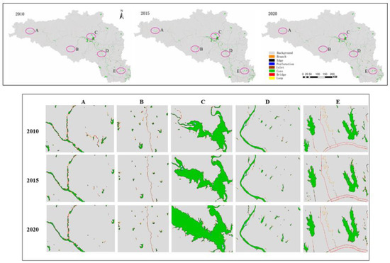 Spatial variation based on MSPA in the study area in 2010, 2015, and 2020; (A,B)—the Hanjiang River’s upper reaches; (C)—the Danjiangkou Reservoir; (D,E)—the Hanjiang River’s middle and lower reaches).