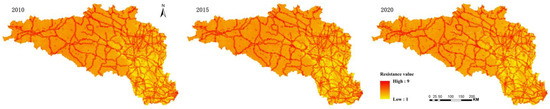 Taking natural and artificial factors into consideration, we can obtain the comprehensive resistance surface of the three periods of the study area through the superposition analysis of the resistance factors (Figure 3). Resistance in the eastern parts is relatively small, but there are also some higher resistance areas, such as the western part of Wuhan City, the central parts of Tianmen City, and Nanyang City, because of the dense distribution of construction land and traffic network. Other high resistance regions are located in the west and north due to large altitude differences. The resistance value gradually increases from east to west, affecting species migration and energy flow between areas. In view of temporal and spatial variation, the high resistance area shows a growing trend from 2010 to 2020, during the first five years of poverty alleviation and development in China’s rural areas, from 2010 to 2015. During this period, the government increased investment and mainly targeted the contiguous destitute areas. Therefore, the areas with increased resistance mainly revolved around road traffic in the Hanjiang River’s upper reaches. The high resistance areas are also grouped mainly in the densely populated and economically developed urban areas from 2015 to 2020.