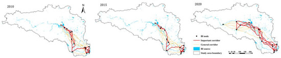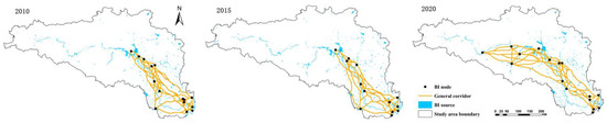 The gravity model was used to construct the interaction matrix between BI sources, and the importance of the corridor was determined based on the strength of the interaction effects. The greater the interaction effects between the target source and the other, the lower the resistance to species migration and flow on the sources, meaning the BI corridor is more important. According to the area of BI source, BI corridors with an interaction force value greater than 300 are regarded as important corridors, and ones with an interaction force value less than 300 are regarded as general corridors. As shown in Figure 5, there were 105 BI corridors in the study area in 2010, including 40 important corridors and 65 general corridors. There were 78 BI corridors in the research area in 2015, including 24 important corridors and 54 general corridors. There were 120 in 2020, including 46 important ones and 74 general ones. Important corridors are generally locations with larger areas and better landscape connectivity. They are concentrated in the Hanjiang River’s middle and lower reaches. These important BI corridors are the main channels for materials exchange and are less disturbed by natural and human factors. So, they are also the paths with the least resistance to species migration. The number of general corridors is large and widely distributed, and they are close to the human activity area. As a result, they are frequently disturbed by human activities. The patch area of general corridors is relatively small, which is not suitable for large-scale species migration activities. In this context, a potential BI network is constructed through the identification of BI sources and important corridors. (Figure 5).