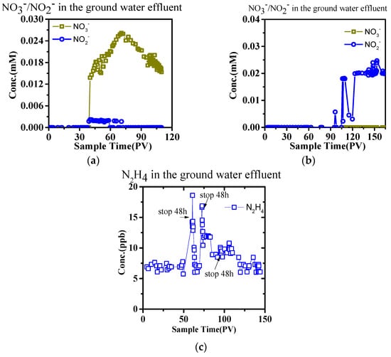 The kinetic curves of NO3− and NO2− in the ground-water effluent under aerobic conditions (a), anaerobic conditions (b), and N2H4 in the effluent under anaerobic conditions (c).