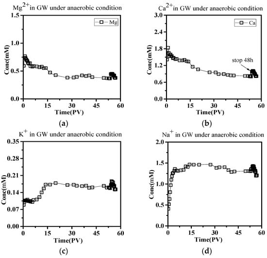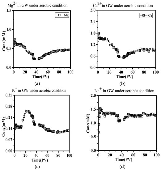 The Ca2+, Mg2+, K+, and Na+ concentrations were analyzed to investigate the effect of ion exchange on the transformation of NH4+. The results indicated that the Ca2+, Mg2+, K+, and Na+ ion exchange process with each other was evident, and they could affect NH4+ behavior (Figure 4 and Figure 5). The dynamic trend of ion exchange with Ca2+ and Mg2+ was similar, which was opposite to the NH4+ concentration trend in the ground effluent. However, the trend of K+ concentration was different from Ca2+ and Mg2+. From the results, it provided important insights into NH4+ behavior in HZ; namely, ammonium ion exchange and the rate of oxidation were affected by the groundwater with chemical condition exchange.