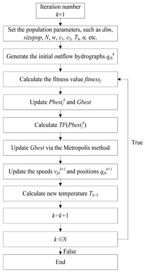 When using the SAPSO algorithm to obtain the optimal operation model for a cascade reservoir system, the outflow of each reservoir is taken as the decision variable. A particle defines a specific outflow scheme. The procedure for solving the optimal cascade reservoir operation scheme using the SAPSO algorithm is as follows: