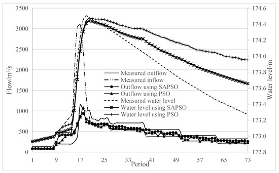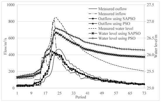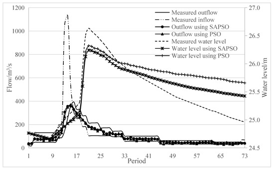 - The optimal operation schemes obtained using the PSO and SAPSO algorithms both increased the outflow in advance of the flood. Indeed, the outflow hydrographs for the two optimization schemes indicated that the outflows as the floods rose were larger, the peak outflows appeared earlier, and the outflows as the floods receded were smaller compared to the measured values. Except for the maximum outflow, the outflows provided by the PSO-based scheme were generally smaller than those provided by the SAPSO-based scheme. Furthermore, the water levels obtained using the PSO- and SAPSO-based schemes were lower than the measured values when the floods rose, whereas those at the end of flood regulation were higher than the measured values. In summary, the two optimization algorithms were not only able to ensure the safety of the reservoirs and downstream flood control areas but also realized the effective utilization of flood-water resources.