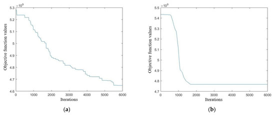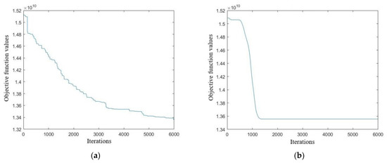 (3) The convergence processes for the SAPSO and PSO algorithms are shown in Figure 7 and Figure 8, respectively. It can be seen that in the process of obtaining the optimal operation schemes for the 31 July 1964 and 13 August 1974 floods, the PSO algorithm fell into a local optimal solution at 1676 and 1338 iterations, respectively. However, the SAPSO algorithm tended to be stable and reached a minimum at 5690 and 5993 iterations, respectively. The minimum values of the PSO and SAPSO algorithms objective functions for the 31 July 1964 flood were 4.77 × 109 and 4.65 × 109, respectively, while those for the 13 August 1974 flood were 1.36 × 1010 and 1.34 × 1010, respectively. Thus, the minimum values of the objective function obtained using the proposed SAPSO algorithm were less than those obtained using the PSO algorithm. In summary, SAPSO algorithm can not only effectively avoid the problem of falling into a local optimal solution in the later stage of the optimization process when using the PSO algorithm but also provide superior objective function values.