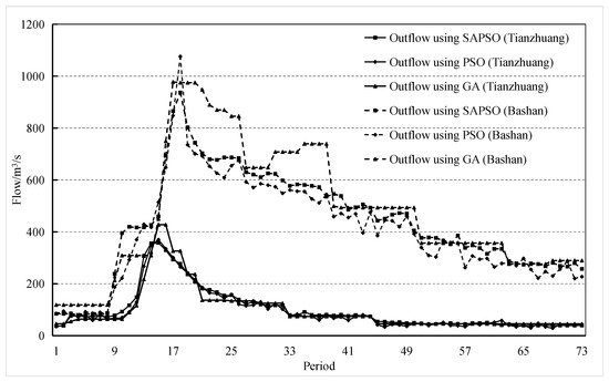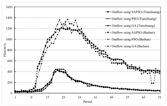 (1) Comparing the maximum outflows shown for the two floods in Table 3 and Table 4, the measured maximum outflows of the two reservoirs were the largest, followed by those under the operation scheme obtained using the PSO algorithm, followed by those under the operation scheme obtained using the proposed SAPSO algorithm. The maximum outflow of Tianzhuang Reservoir when operated according to the PSO-obtained solution decreased by 6.2% and 5.7% compared with the measured values in the 31 July 1964 and the 13 August 1974 floods, respectively; the maximum outflow of Bashan Reservoir when operated according to the PSO-obtained solution decreased by 8.1% and 9.2% compared with the measured values in the 31 July 1964 and 13 August 1974 floods, respectively. Notably, the maximum outflow of Tianzhuang Reservoir when operated according to the SAPSO-obtained solution decreased by 9.3% and 8.6% compared with the measured values in the 31 July 1964 and 13 August 1974 floods, respectively; the maximum outflow of Bashan Reservoir when operated according to the SAPSO-obtained solution decreased by 18.5% and 13.5% compared with the measured value in the 31 July 1964 and 13 August 1974 floods, respectively. Thus, both the PSO and SAPSO algorithms reduced the maximum outflow of the two reservoirs, with the proposed SAPSO algorithm providing superior performance.
