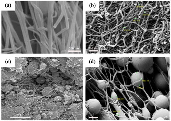 Adsorption is a surface phenomenon whose effects are determined by the adsorbents’ shape and porosity []. Figure 1a–d shows the morphological properties of PET NF, MWCNTs, and PET NF-MWCNTs composite before and after MB dye adsorption on the NF surface []. As shown in Figure 1a, the diameter of the electrospun PET NF was less than 100 nm. Figure 1b depicts a typical SEM image of MWCNTs. This view highlights the crystalline tubular structure of the nanotubes. It had an inner diameter of 5–10 nm, an outer diameter of 10–50 nm, and a length of 5–30 mm. Figure 1c depicts a PET NF-MWCNTs composite before MB dye adsorption. It shows the presence of MWCNTs on the surface of the PET NF and irregular pores of various shapes and sizes.