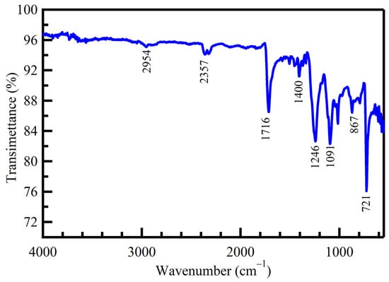 Various functional groups on the PET NF-MWCNTs composite were investigated via FTIR spectroscopy. Compared to the FTIR for PET NF synthesized in the previous study [], the addition of MWCNTs to the PET NF introduced some additional absorption bands to the spectra. Figure 2 depicts the unique peaks of the PET NF-MWCNTs composite adsorbent. The 2954 cm−1 band was assigned to the stretching vibrational of C–H aromatic and aliphatic groups. Carbonyl stretching (C=O) is responsible for the band at 1716 cm−1 []. The major peaks were detected at 1504 and 1400 cm−1 due to stretching vibrations of C=C and aromatic rings stretching, respectively []. CO–O stretching can be assigned to the band at 1246 cm−1.