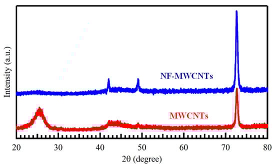 Figure 3 depicts XRD analysis of MWCNTs, and the PET NF-MWCNTs composite. The C (002) diffraction peak in the MWCNTs pattern at 2θ = 26.1º relates to an orderly arrangement of hexagonal graphitic cylinders. Graphite’s C (100), C (004), and C (110) diffraction peaks at 2θ = 42.0º, 49.0º, and 72.5º, respectively, are also well-known []. The C (002) peak is absent from the PET NF-MWCNTs composite’s XRD pattern. However, the XRD pattern of the PET NF-MWCNT composite exhibits an increase in the diffraction peaks at 42.0º and 49.0º, which are associated with PET NF. This is related to the PET polymer’s progressive perfection and the well-established nucleating influence in the presence of MWCNTs, which dramatically speeds up the crystallization of PET NF [].