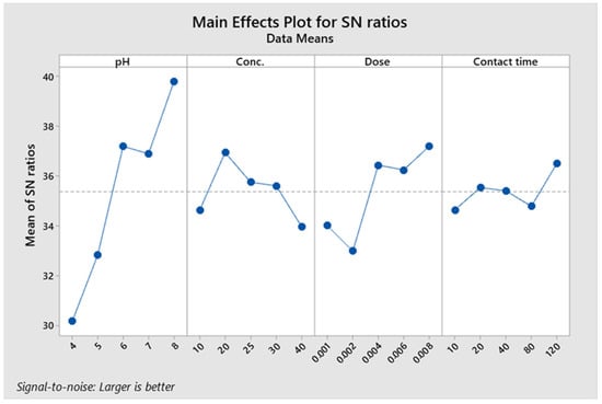 The S/N ratio is depicted in Figure 4 as the dependent parameters concerning pH, adsorbent dose, and contact time, as demonstrated in the main effect plot of MB dye removal percentage. Based on the figure, it is possible to identify the most important parameters and the optimum levels []. As a result, the optimal parameter levels for maximal %R of MB dye were pH of 8, 20 mg L−1 (MB dye initial concentration), the PET NF-MWCNTs dose of 0.008 g, and contact time of 120 min. Accordingly, the highest experimental MB dye removal effectiveness of 94.786% (S/N = 44.3068) was attained to verify that the anticipated response value was accurate and carried out under the above-mentioned optimal circumstances.