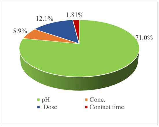 An Analysis of Variance (ANOVA) evaluated the overall relevance of different factors on the experiment response (%R). Table 4 displays the ANOVA findings. The values of freedom degree (DOF), the total sum of squares variance (SS), mean square (MS), Fisher’s test (F-value), probability of occurrence (p-value), and percent of contribution (P, %) for each parameter in the response are obtained in ANOVA analysis (general linear model) []. According to the ANOVA design, the lower the p-value of the tested parameter (near to zero), the more successful it is. The sum of squares (SS) will be crucial under the same scenario, so the greater the SS value, the more effective []. The %P contributions of pH, initial MB dye concentration, adsorbent dose, and contact time were 71.01%, 5.91%, 12.08% and 1.81%, respectively. The pH solution had the greatest %P, indicating that the pH of the dye solution heavily impacted the adsorption process. However, the contact time had the lowest %P. Figure 5 graphically depicts the contribution of each parameter to MB dye adsorption. As can be observed, the results of the ANOVA analysis for MB dye adsorption from solution by the PET NF-MWCNTs composite were similar to the results of the preceding section’s examination of the influence of the parameters studied.