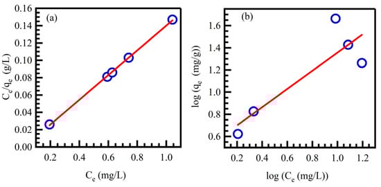 where Qm is maximum adsorption capacity (mg g−1), KL is Langmuir constant (L mg−1), KF is Freundlich constant (L g−1), and represents an empirical constant indicating the adsorption intensity.