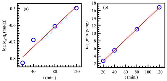 Adsorption kinetics studies provide a great deal of relevant information on the mechanism and performance of adsorption that may be utilized to construct an industrial treatment facility. In this study, two kinetic models, pseudo-first-order Equation (7), and pseudo-second-order Equation (8), were used to model the experimental data and are stated as follows [,]: