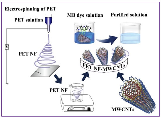 Different materials, such as metal-organic frameworks (MOFs) [], nanoscale zero-valent irons (nZVI) [], and carbon nanotubes (CNTs) [,], have been employed to remove various contaminants from wastewater in the past few years. CNTs are used to remove dyes from wastewater due to their high mechanical strength, low cost, and high affinity for pollutant molecules []. Carbon nanotubes (CNTs) can be modified via polymers to enhance their electrical, mechanical, and thermomechanical characteristics [,]. It was because of their high surface area, high porosity, hollow and layered structures, and electrical and hydrophobic interactions with pollutant ions. They have attracted the attention of those interested in removing dye pollutants from wastewater [,]. They are classified as single-walled carbon nanotubes (SWCNTs) and multi-walled carbon nanotubes (MWCNTs) []. The layout of graphene cylinders change between the two types of CNTs. MWCNTs are created by rolling graphene into concentric tubes (many layers) and then connecting them to form a single structure. They have higher adsorption effectiveness than SWCNTs due to their greater surface area per unit weight [].