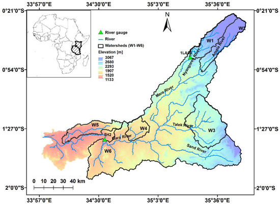 The location of the Mara Basin in East Africa. Selected sample watersheds with varying aridity and landscape characteristics are marked with W1–W6. The inset map shows the boundary of Kenya and Tanzania.