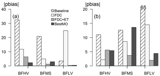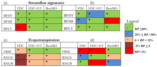 To evaluate the added value of each calibration strategy, we compared the relative performances of the calibrated SWAT models to the baseline model performances. Here, the relative performance (RP) for streamflow signatures (BFHV, BFMS and BFLV) and evapotranspiration (pbias) of the baseline and calibrated SWAT models was computed as