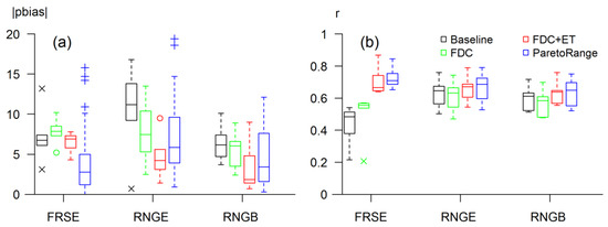 Comparison of 8-day simulated and remote sensing-based evapotranspiration annually (2002–2007) for evergreen forest (FRSE), savanna grassland (RNGE) and shrubland (RNGB) using boxplots: (a) percent of bias (pbias) and (b) correlation coefficient (r).